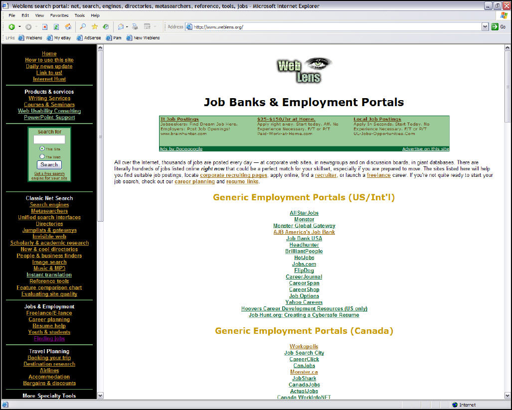 The Web is an almost infinite universe of information. Most of the time, however, locating what you need is like finding a needle in a haystack. Not any more! This gateway to thousands of useful Internet research tools and resources was created as a companion resource for Pam Blackstone's newspaper column. The column is no longer published, but we are committed to continuing to make this comprehensive Internet research resource available for your convenience. WebLens features links to thousands of the Net's most popular search engines, directories, metasearch tools, music and image searchers, people finders, company locators, reference tools, job databases, recipe archives, scholarly research resources and more. Please feel free to bookmark this comprehensive collection of Net search tools and come back often.